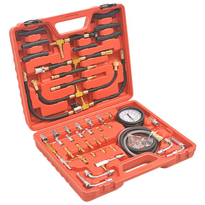 Deze professionele brandstofinjectiedruktestset bevat adapters, slangen, klemmen en fittingen. De set is geschikt voor mechanische en elektrische benzine-injectiesystemen en de meeste auto's en vrachtwagens, zoals BMW, GM, Ford, Toyota, Nissan en andere benzineauto's.