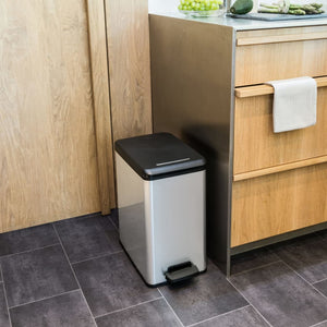 - Metaalachtige afwerking voor een eersteklas uitstraling: de rechthoekige pedaalemmer heeft de trendy uitstraling van een metalen prullenbak, maar de voordelen van een kunststof prullenbak. Hij is lichtgewicht en heeft een roest- en deukvrije buitenkant. Vingerafdrukken zijn ook niet te zien op de pedaalemmer.