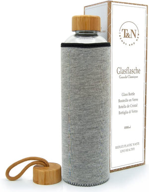 Glazen Fles 1000/750/500 ml - Glazen Waterfles 1 Liter met Neopreen Hoes - Lekvrije Waterfles met grijze sleeve - T&N