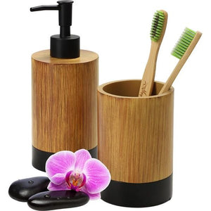 2-delige badkamerset, zeepdispenser en tandenborstelbeker in houtlook - badkameraccessoires voor toilet, hygiënische badset voor thuis en badkamer - Hout/Zwart KADAX